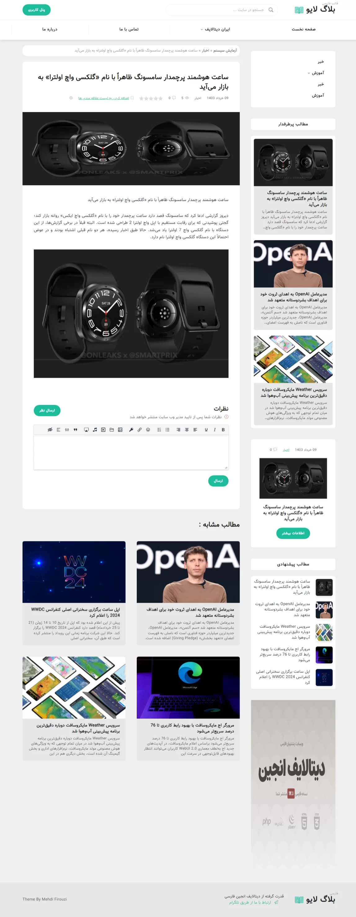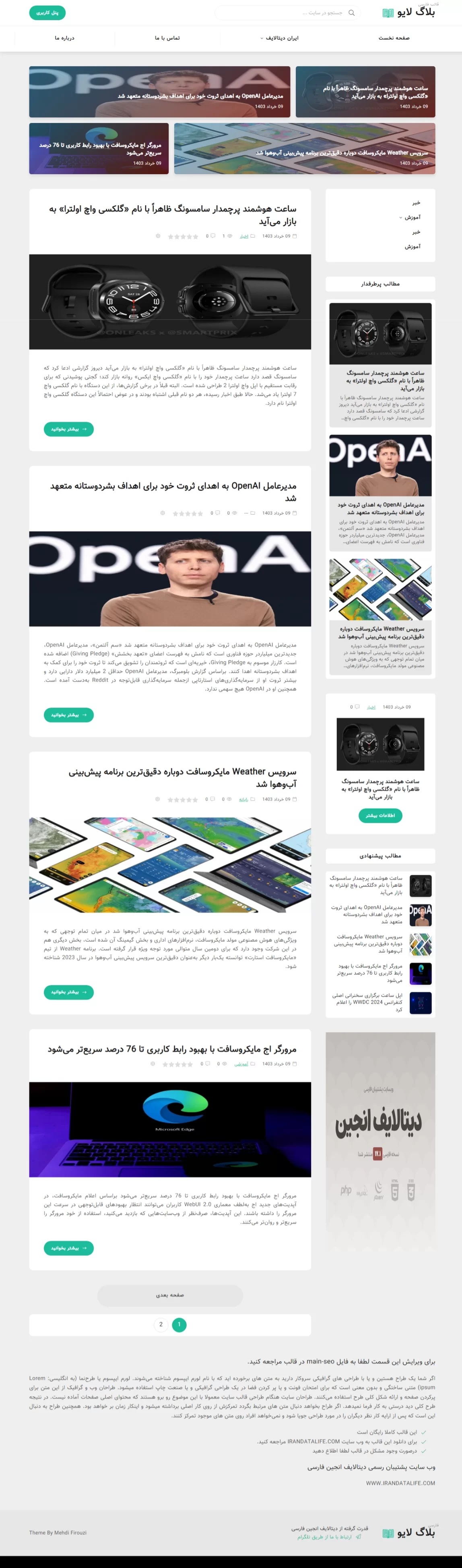 بلاگ لایو ، پوسته ای زیبا در عین حال پر کاربرد جهت اجرای وبسایت با هر موضوعی رو داراست. هم اکنون این قالب بسیار زیبا و کاربردی به صورت کاملا رایگان از ایران دیتالایف منتشر میشود و میتوانید در وبسایت های دیتالایفی خود از آن استفاده کنید.