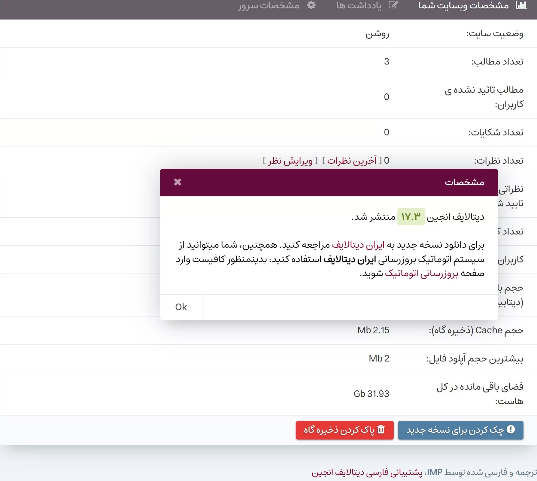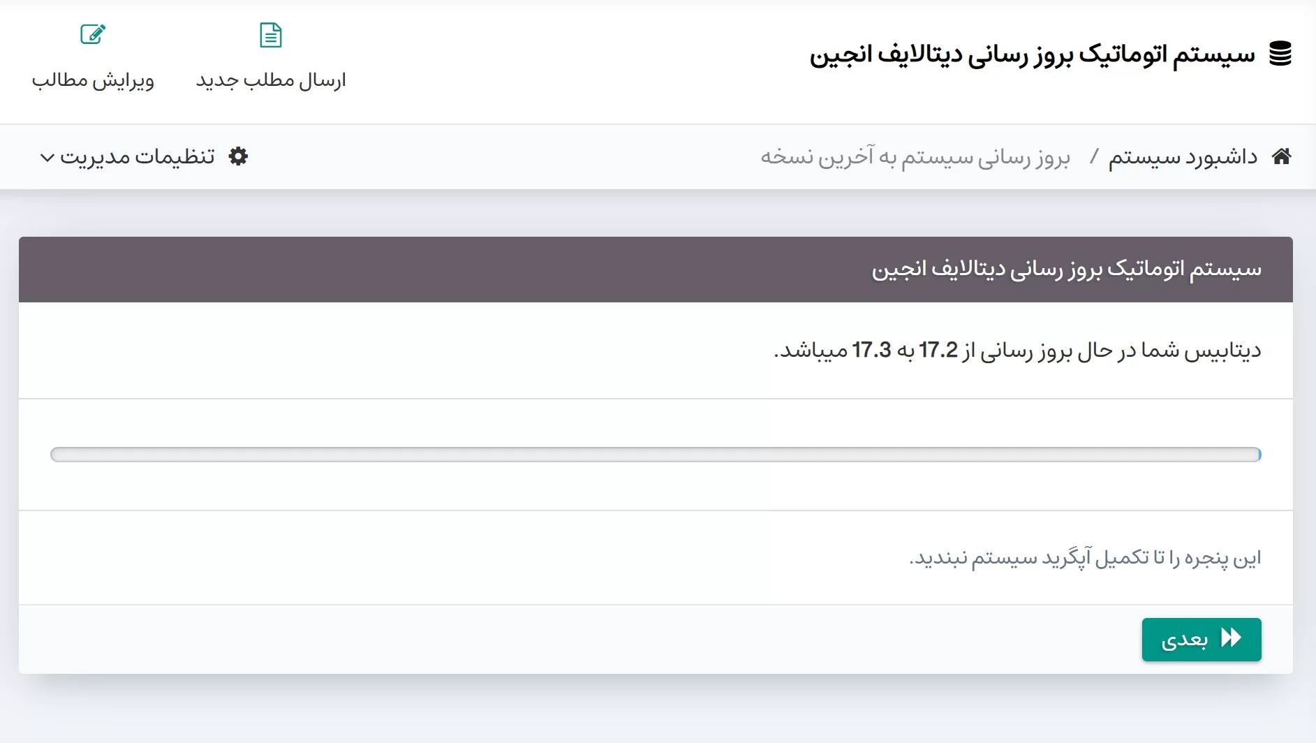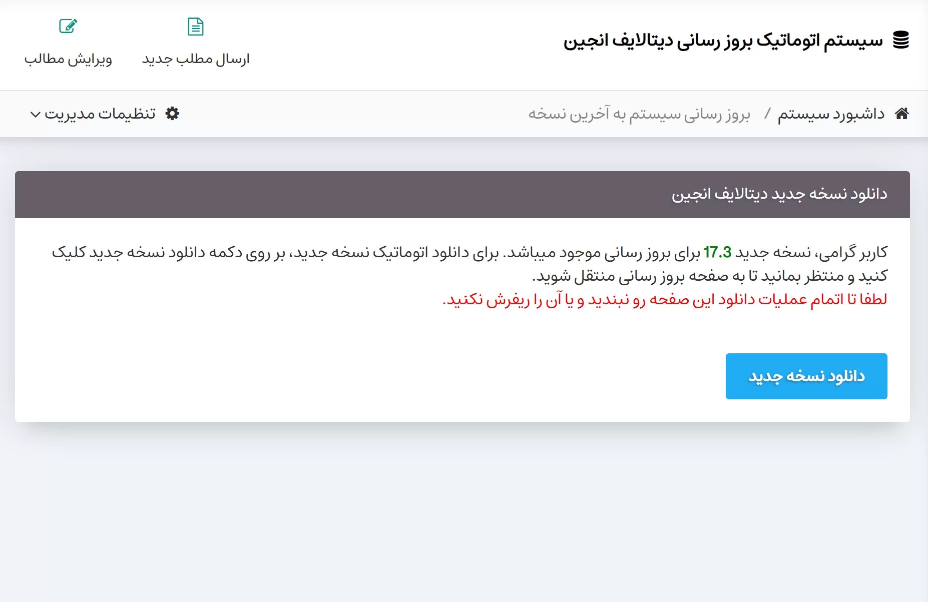 توجه: هنگام دانلود نسخه جدید، نباید صفحه بروز رسانی را ببندید و یا آن را ریفرش کنید. این قابلیت بر روی نسخه های ۱۷.۲ و ۱۷.۳ نصب شده است. تمامی نسخه های جدید نیز از این قابلیت بهرمند خواهند شد. برای اضافه کردن این قابلیت به سیستم، تغییراتی در فایل های سیستم ایجاد نشده است. این قابلیت تنها به پلاگین فارسی سازی سیستم اضافه شده است و تنها چند خط کد ساده به فایل بروز رسانی سیستم اضافه میکند و هیچ گونه تغییر دیگری بر روی سیستم ایجاد نمیکند.