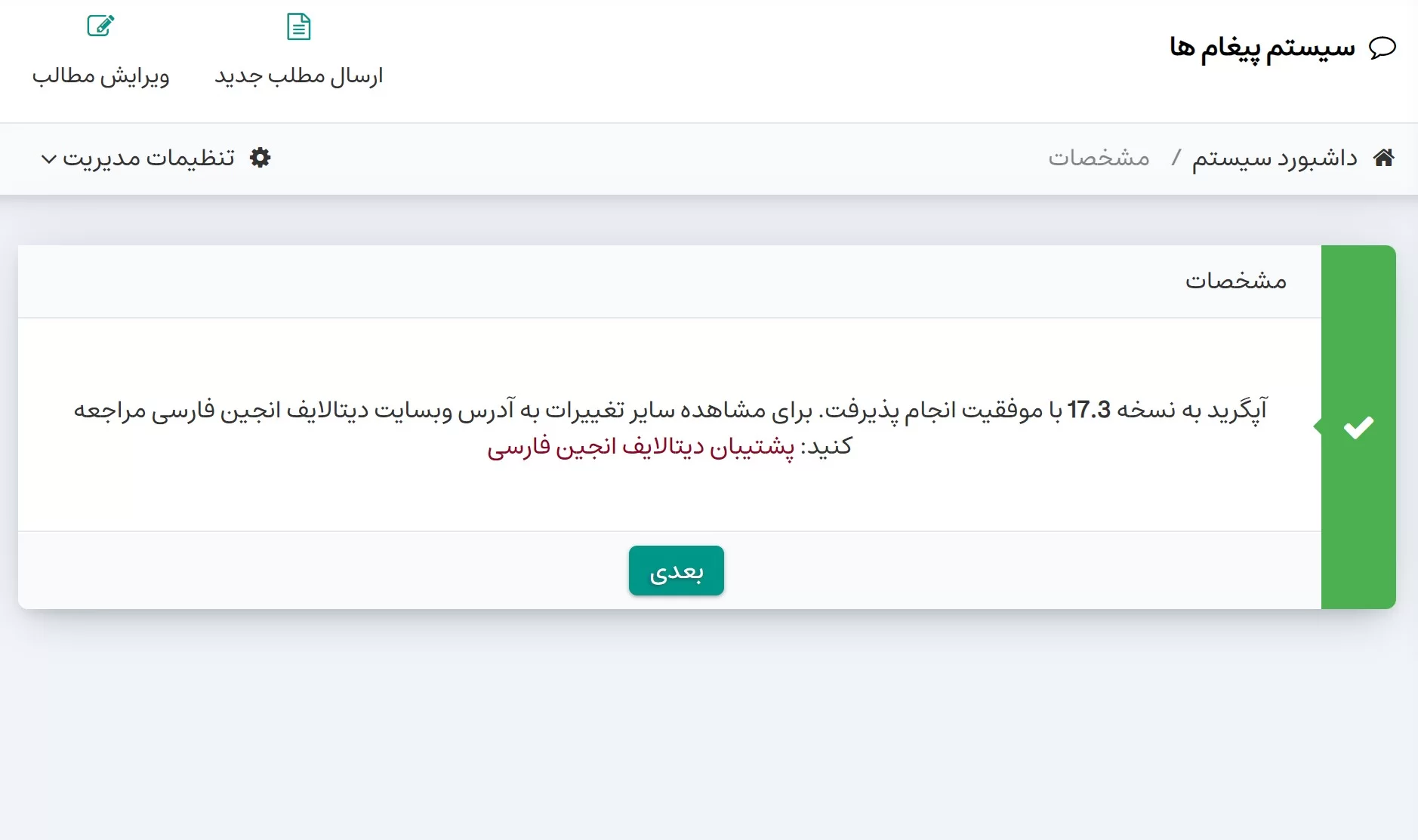 تنها کافیست بر روی دکمه "چک کردن برای نسخه جدید" در صفحه اصلی کنترل پنل کلیک کنید، چنانچه نسخه جدیدی توسط ایران دیتالایف منتشر شده باشد، در پنجره پیغام سیستم، میتوانید بر روی لینک "بروز رسانی اتوماتیک" کلیک کنید تا نسخه جدید توسط سرور شما دانلود و مراحل ارتقای سیستم را دنبال کنید.